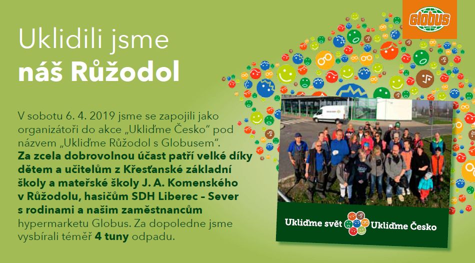 V sobotu 6. 4. 2019 jsme se zapojili spolu se zaměstnanci hytermarketu Globus a dětmi a učiteli Křesťanské základní školy J. A. Komenského do akce "Ukliďme Česko". Pro úklid jsme si vybrali prostor kolem hypermarketu, cyklostezky kolem Nisy a samozřejmě okolí našeho hřiště.